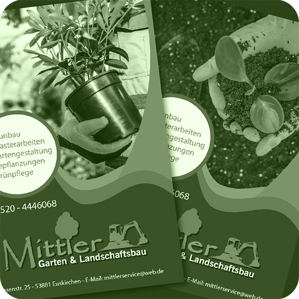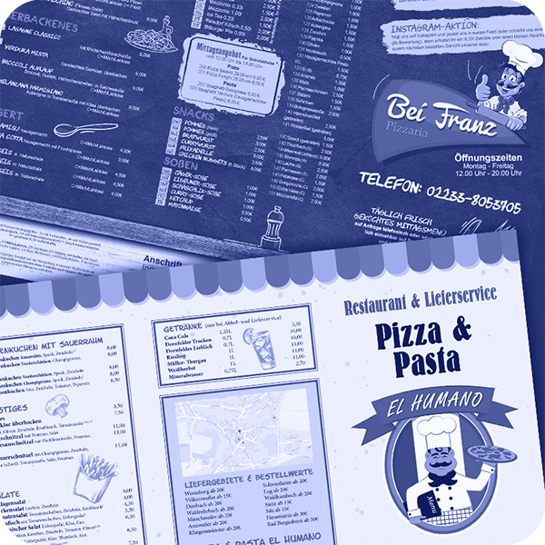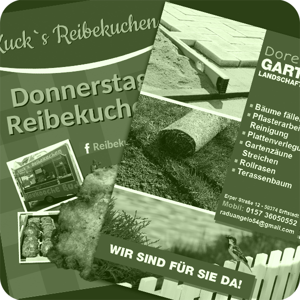 Dazu gehören originelle Werbedrucksachen, Geschäftspapiere, Flyer, Plakate, Visitenkarten, Imagebroschüren, Großformatdruck, Inserate, Aufkleber.